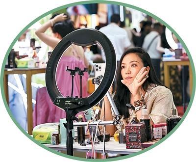 主播在第六届消博会的一家化妆品展台直播。新华社记者 高静 摄